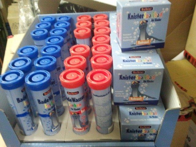 Kinder-Shampoo und Badespaß mit Knisterperlen. In rot und blau.