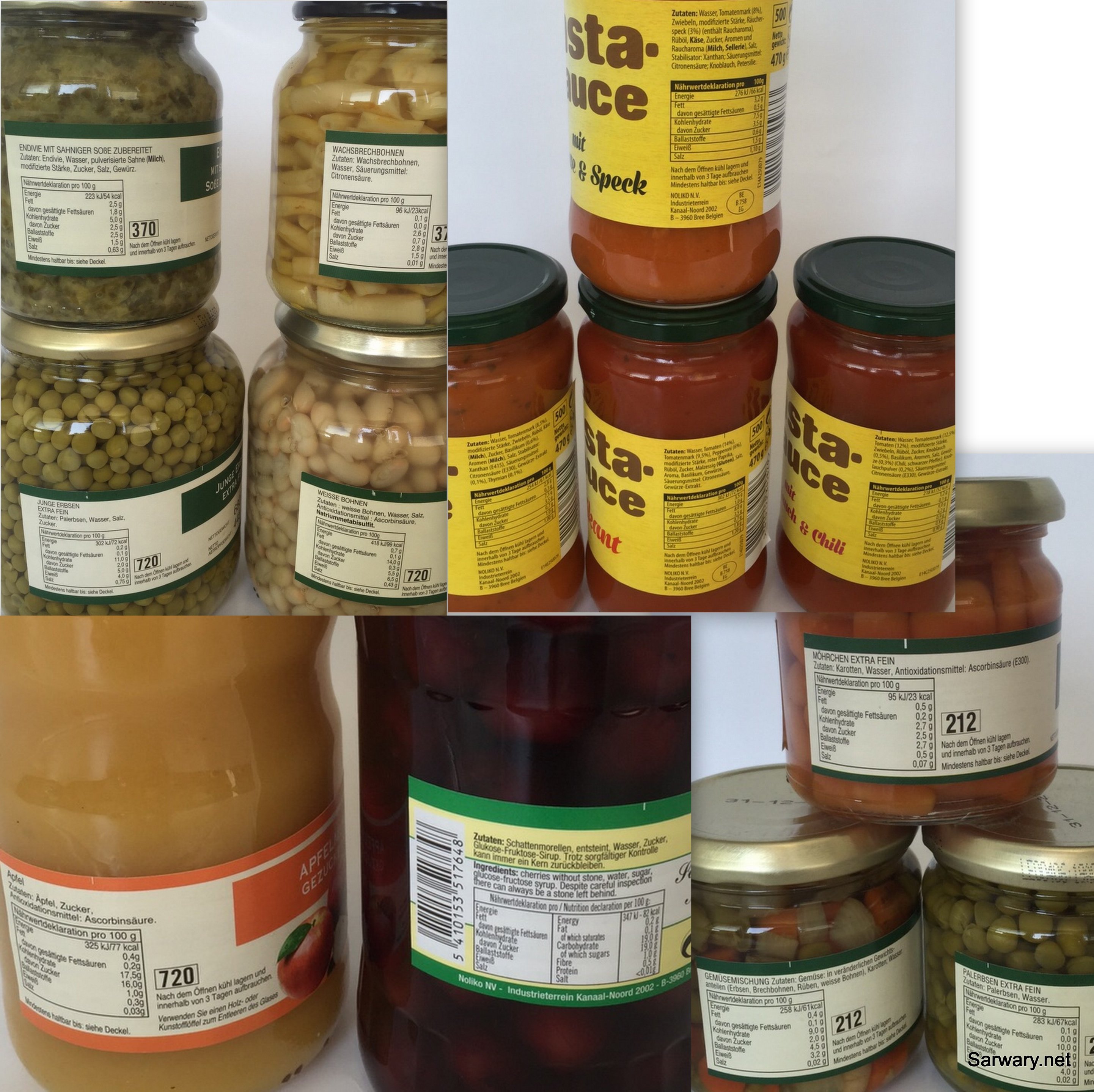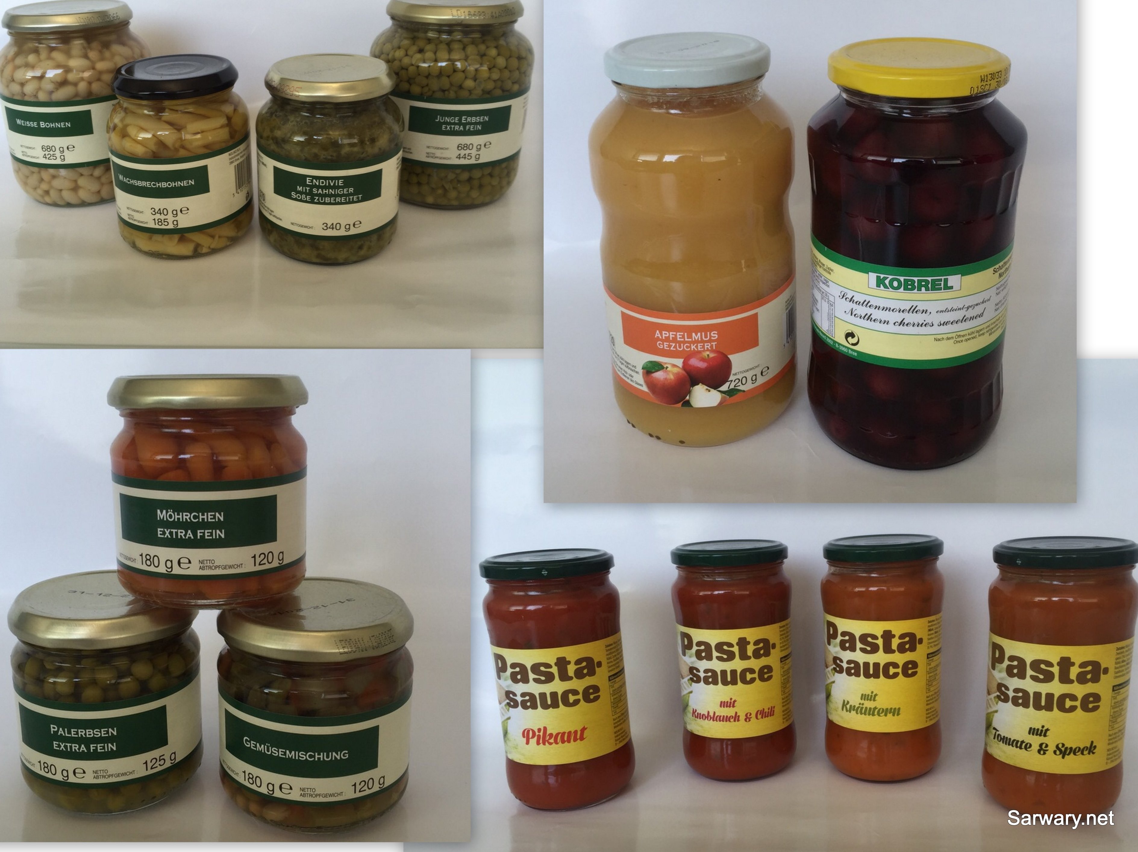 Verschiedene Pasta-Saucen, verschiedenes Gemüse, Apfelmus und Kirschen im Glas.
